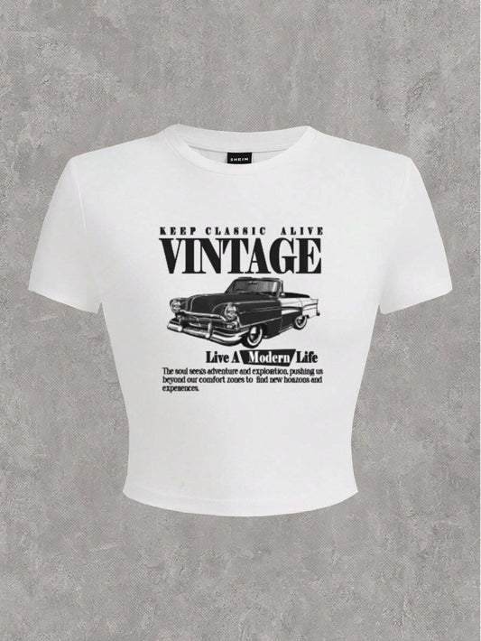 SHEIN EZwear Camiseta con gráfico de automóvil y letra