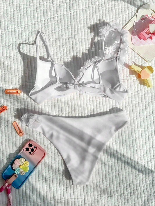 SHEIN Swim Conjunto de bikini con cuello en V, tirantes y decoración de flores