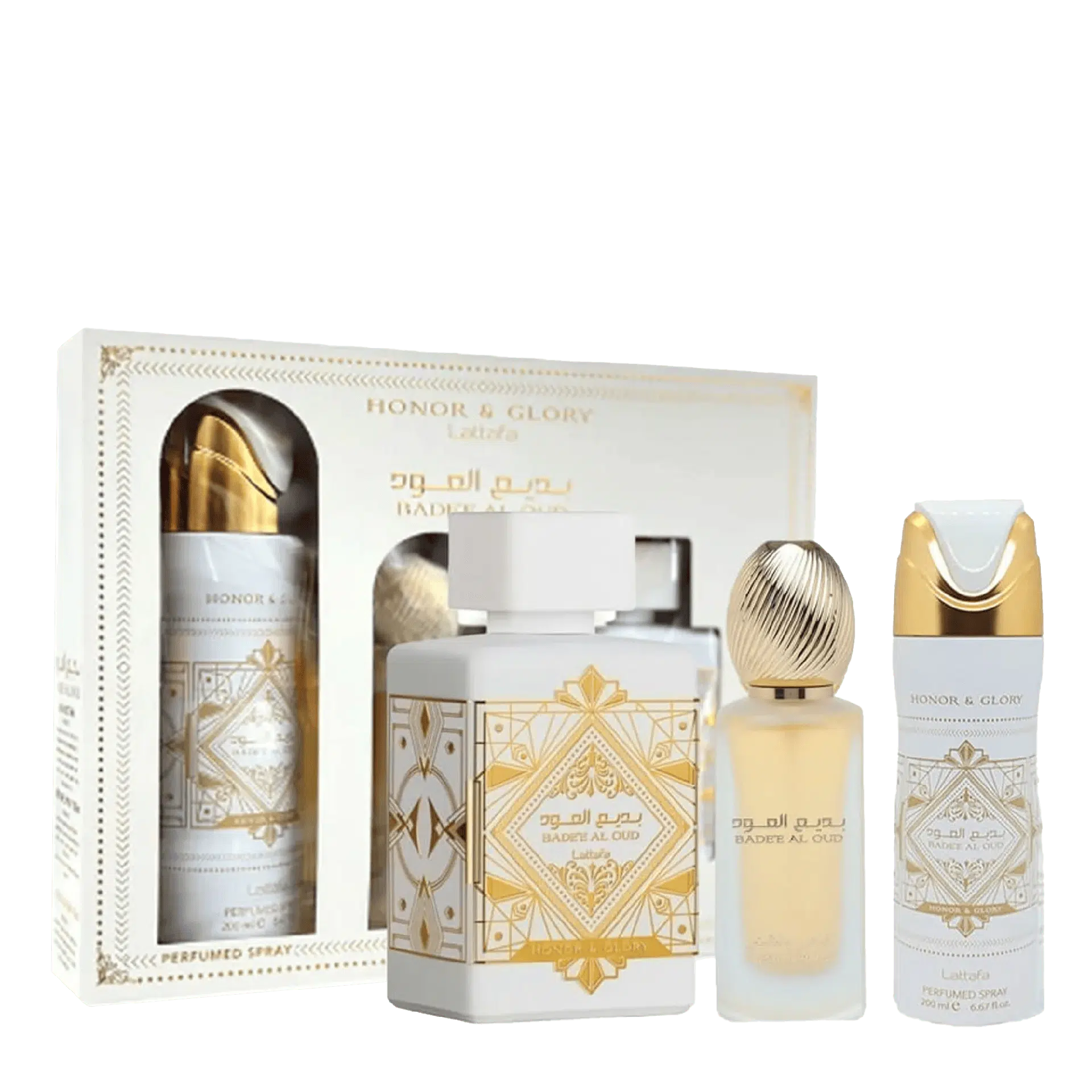 LATTAFA- Set Badee Al Oud Honor And Glory 3 Pcs 100 Oz Edp + 200 Oz Deo + 1.7 Oz Hairmist